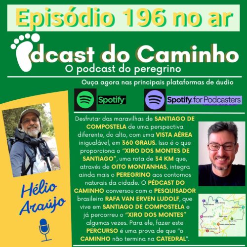 O grande jornalista HÉLIO ARAÚJO continua com seus “pédcasts” sobre os Caminhos de Santiago, “O PODCAST DO PEREGRINO”, que vai ao ar toda terça-feira. Está no ar o episódio 196 do “Pédcast no qual o apresentador conversa com o pesquisador brasileiro RAFA VAN ERVEN LUDOLF, que vive em Santiago de Compostela, que percorreu o “XIRO DOS MONTES DE SANTIAGO”, rota de 34 Km, através de oito montanhas, que apresenta uma vista aérea de 360º. OS INTERESSADOS PODEM ACESSAR O LINK DESCRITO NO POSTER.
