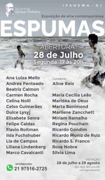 – ATÉ 29 DE AGOSTO, “ESPUMAS – Exposição de arte contemporânea”. Entre os expositores, os poetas e amigos REGINA POUCHAIN e RICARDO MUNIZ DE RUIZ. Curadoria: ALINE REIS. Local: Casa do Artista GERSON PINHEIRO, Ipanema. Segunda, quarta e sexta, das 9h às 16h, com agendamento. DETALHES E PARTICIPANTES NO POSTER.