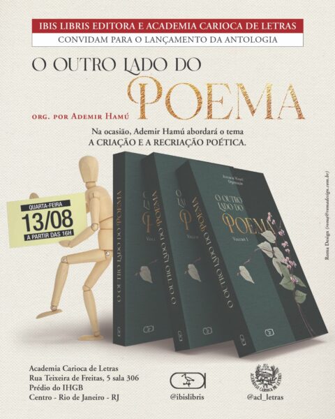 – DIA 13 DE AGOSTO, A PARTIR DAS 16h, “O OUTRO LADO DO POEMA” (antologia), org. de ADEMIR HAMÚ que, na ocasião, falará sobre o tema “A criação e a recriação poética”. Local: Academia Carioca de Letras, Rua Teixeira de Freitas, 5, sala 306, prédio do IHGB, Centro.