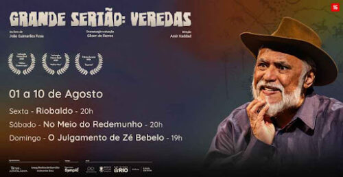 – ATÉ 10 DE AGOSTO, “TRILOGIA GRANDE SERTÃO: VEREDAS”. Direção: AMIR HADDAD. Com GILSON DE BARROS que encena peças inspiradas na obra de GUIMARÃES ROSA: SEXTA: “RIOBALDO”; SÁBADO: “NO MEIO DO REDEMUNHO”; DOMINGO: “JULGAMENTO DE ZÉ BEBELO”. SEXTA e SÁBADO, ÀS 20h; DOMINGO, ÀS 20h. R$ 80,00. Local: Cidade das Artes, Sala Eletroacústica), Barra.