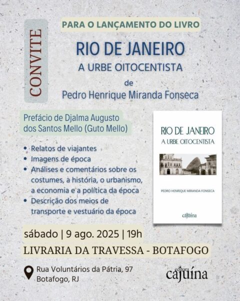 – AMANHÃ, DIA 09 DE AGOSTO, ÀS 19h, “A URBE OITOCENTISTA”, de PEDRO HENRIQUE MIRANDA FONSECA. Local: Livraria da Travessa, Rua Voluntários da Pátria, 97, Botafogo