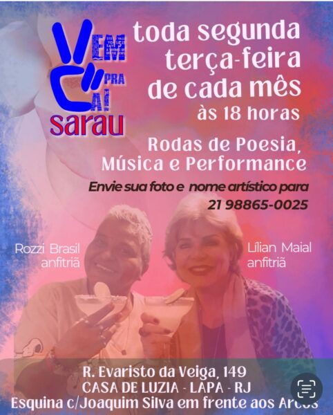 – DIA 12 DE AGOSTO, ÀS 18h, “VEM PRA CÁ! SARAU”, rodas de poesia, música e performance, organização ROZZI BRASIL e LILIAN MAIAL. Local: R. Evaristo da Veiga, 149, Casa de Luzia, esquina com Joaquim Silva, em frente aos Arcos, Lapa.