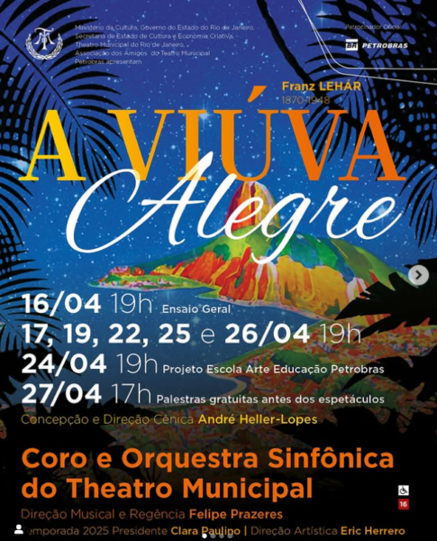 – ATÉ 27 DE ABRIL, “A VIÚVA ALEGRE”, de FRANZ LEHAR, com o CORO E A ORQUESTRA SINFÔNICA DO THEATRO MUNICIPAL. Concepção: ANDRÉ HELLER-LOPES; direção musical: FELIPE PRAZERES. SÁBADOS (19 e 26); TERÇA (22); SEXTA (25), ÀS 19h. DOMINGO (27), ÀS 17h. De R$ 20,00 a R$ 90,00.