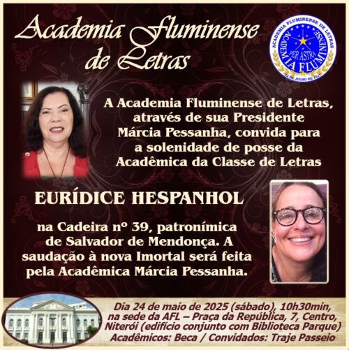 – DIA 24 DE MAIO, ÀS 10h30, a ACADEMIA FLUMINENSE DE LETRAS convida para a solenidade de posse de EURÍDICE HESPANHOL. A saudação será feita pela acadêmica MÁRCIA PESSANHA. Local: AFL – Praça da República, 7, Centro, Niterói. Traje passeio. NOSSOS PARABÉNS À NOVA ACADÊMICA.