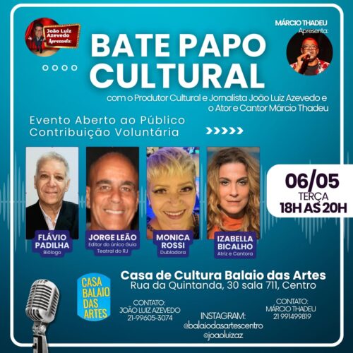 – DIA 06 DE MAIO, DAS 18h ÀS 20h, “BATE PAPO CULTURAL”, com JOÃO LUIZ AZEVEDO e MÁRCIO THADEU. Convidados: FLÁVIO PADILHA, JORGE LEÃO, MONICA ROSSI e IZABELLA BICALHO. Local: Casa de Cultura Balaio das Artes, Rua da Quitanda, 30, sala 711, Centro. Contribuição voluntária.