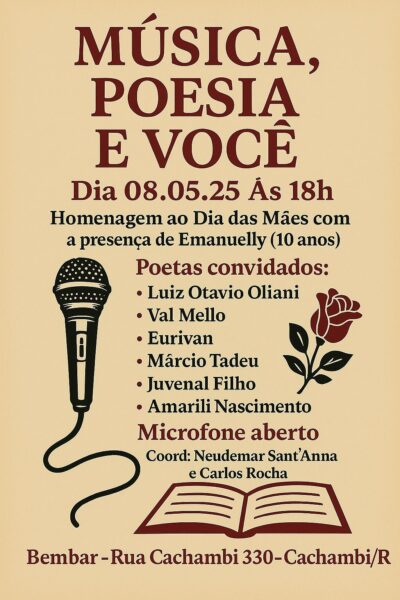 – DIA 08 DE MAIO, ÀS 18h, “MÚSICA, POESIA E VOCÊ”, homenagem ao Dia das Mães. Com: LUIZ OTAVIO OLIANI, VAL MELLO, EURIVAN, MÁRCIO THADEU, JUVENAL FILHO e AMALRI NASCIMENTO. Coordenação: NEUDEMAR SANT’ANNA e CARLOS ROCHA. Local: BemBar, Rua Cachambi, 330, Cachambi.