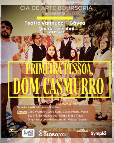 – DIAS 23 e 30 DE ABRIL, ÀS 20h, “PRIMEIRA PESSOA, DOM CASMURRO”, com a CIA. DE ARTE BOURSORIA. Direção e roteiro: ALINE BOURSEAU, com CLARA WERNECK, GREG SORIA e outros. Local: Teatro Vannucci, Shopping da Gávea, Rua Marquês de São Vicente, 52, 3º andar, loja 371, Gávea. R$ 80,00 e R$ 40,00.