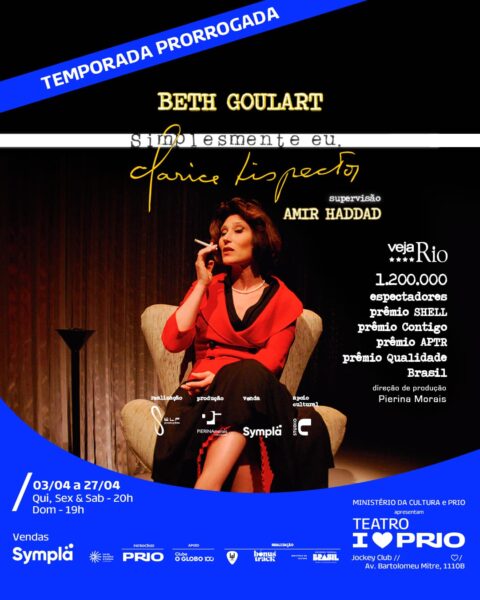 – ATÉ 27 DE ABRIL, a premiada “SIMPLESMENTE EU, CLARICE LISPECTOR”, com BETH GOULART. Local: Teatro Prio, Jockey Club Brasileiro. Sexta e sábado, às 20h; domingo, às 19h. R$ 120.00.