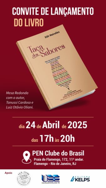 – DIA 24 de ABRIL, DAS 17h às 20:30h, “TAÇA DOS SABORES”, de EDIR MEIRELLES. Mesa redonda com LUIZ OTÁVIO OLIANI e TANUSSI CARDOSO. Local: PEN Clube do Brasil, Praia do Flamengo, 172, 11 andar, Flamengo.