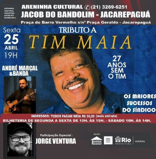 – DIA 25 DE ABRIL, ÀS 19h, “TRIBUTO A TIM MAIA” – 27 ANOS SEM O TIM”, com ANDRÉ MARÇAL & BANDA e participação de JORGE VENTURA. Local: Areninha Cultural Jacob do Bandolim, Praça do Barro Vermelho s/nº Praça Geraldo, Jacarepaguá. TODOS PAGAM R$ 30,00.