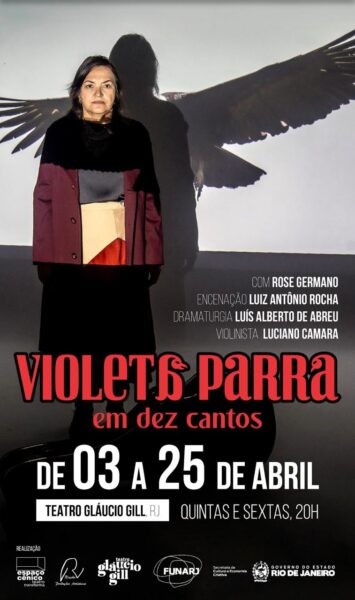 – ATÉ 25 DE ABRIL, ÀS 20h, “VIOLETA PARRA EM DEZ CANTOS”, de LUIZ ALBERTO DE ABREU, com ROSE GERMANO. Direção: LUIZ ANTÔNIO ROCHA. Local: Teatro Gláucio Gill. Quinta e sexta.