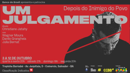 – ATÉ 03 DE NOVEMBRO, “UM JULGAMENTO – DEPOIS DO INIMIGO DO POVO”, com WAGNER MOURA, DANILO GRANGHEIA e JULIA BERNAT. Adaptação do clássico de IBSEN. Direção: CHRISTIANE JATAHY. Local: CCBB, Centro. Quarta a sábado e segunda. Às 19h; domingo, às 18h. R$ 30,00.