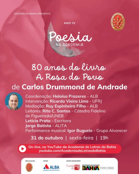 – HOJE, DIA 31 DE OUTUBRO, ÀS 19h, “POESIA NA ACADEMIA – 80 ANOS DO LIVRO A ROSA DO POVO, DE CARLOS DRUMMOND DE ANDRADE”. Coordenação de HELOÍSA PRAZERES, com a participação, entre outros, de RICARDO VIEIRA LIMA e RUY ESPINHEIRA FILHO. ON-LINE, pelo YOU TUBE da ACADEMIA DE LETRAS DA BAHIA. TODOS OS DETALHES NO LINK DO POSTER: