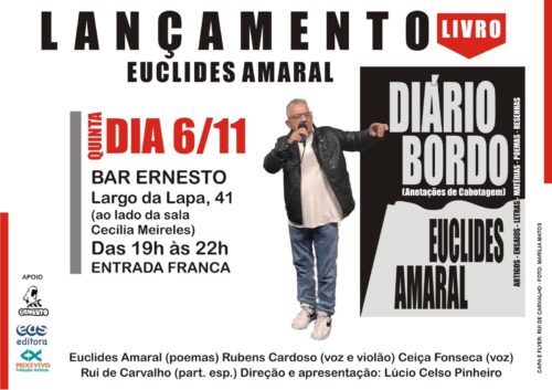 – DIA 06 DE NOVEMBRO, DAS 19h ÀS 22h, “DIÁRIO BORDO – ANOTAÇÕES DE CABOTAGEM”, de EUCLIDES AMARAL. Direção e apresentação: LÚCIO CELSO PINHEIRO. Com RUBENS CARDOSO, CEIÇA FONSECA e RUI DE CARVALHO. Local: Bar Ernesto. Largo da Lapa, 41, ao lado da sala Cecília Meireles. Entrada franca. IMPERDÍVEL!