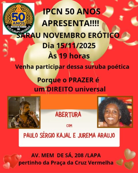 – DIA 15 DE NOVEMBRO, ÀS 19h, “SARAU NOVEMBRO ERÓTICO”, com PAULO SÉRGIO KAJAL e JUREMA ARAUJO. Local: Av. Mem de Sá, 208, Lapa, perto da Cruz Vermelha.