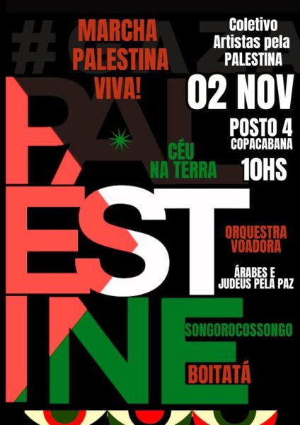 – DIA 02 DE NOVEMBRO, A PARTIR DAS 10h, “MARCHA PALESTINA VIVA!”, com o COLETIVO ARTISTAS PELA PALESTINA, CÉU NA TERRA, ORQUESTRA VOADORA, ÁRABES E JUDEUS PELA PAZ, SONGOROCOSSONGO, BOITATÁ. Local: Posto 4, Copacabana.