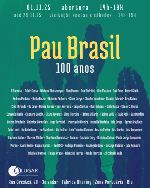 – DE AMANHÃ, DIA 1º DE NOVEMBRO, ATÉ 29 DE NOVEMBRO, DAS 14h ÀS 19h, “PAU BRASIL – 100 ANOS”. Todos os participantes estão no poster, entre eles, os amigos SOLANGE PADILHA e TCHELLO d’ BARROS. Local: Fábrica Behring, Galeria O Lugar, Rua Orestes, 28, 3º andar, Santo Cristo, Porto Maravilha. Visitações: sextas e sábados.