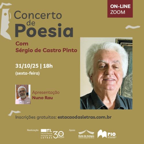 – HOJE, DIA 31 DE OUTUBRO, ÀS 18h, “CONCERTO DE POESIA”, com SÉRGIO DE CASTRO PINTO. Apresentação: NUNO RAU. ON-LINE ZOOM, inscrições gratuitas: estacaodasletras.com.br. IMPERDÍVEL!