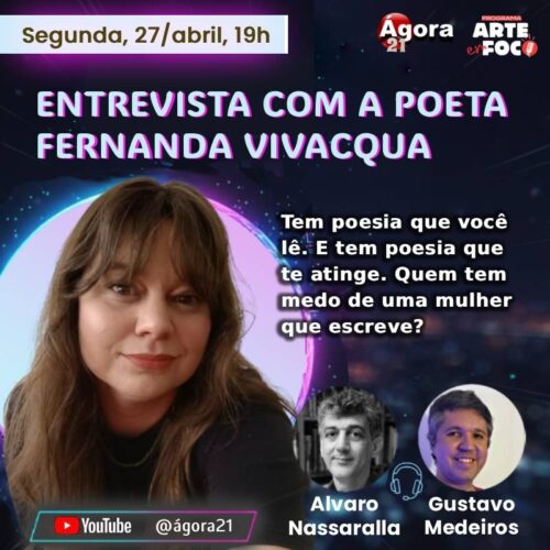 – DIA 27 DE ABRIL, ÀS 19h, “ARTE EM FOCO ENTREVISTA A POETA e DOUTORA EM LETRAS FERNANDA VIVACQUA”. Com ALVARO NASSARALLA e GUSTAVO MEDEIROS. Local: YouTube: @ágora21.