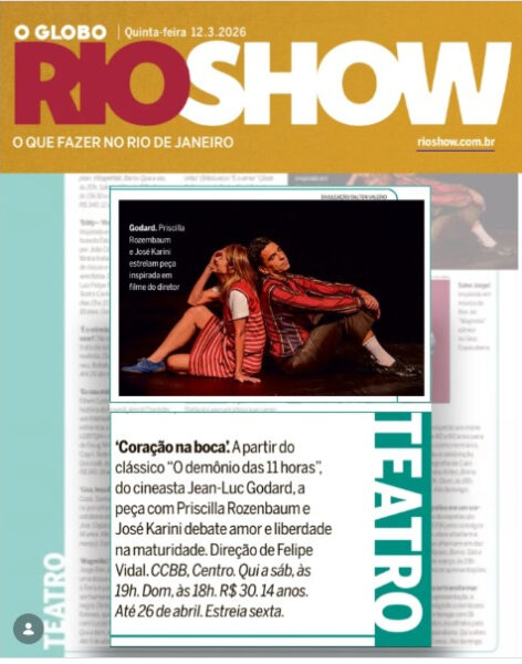 – ATÉ 26 DE ABRIL, “CORAÇÃO NA BOCA”, baseado no filme “O DEMÔNIO DAS 11 HORAS”, de JEAN-LUC GODARD, com PRISCILLA ROZENBAUM e JOSÉ KARINI. Direção: FELIPE VIDAL. Local: CCBB, Centro. Quinta a sábado, às 19h; domingo, às 18h. R$ 30,00.