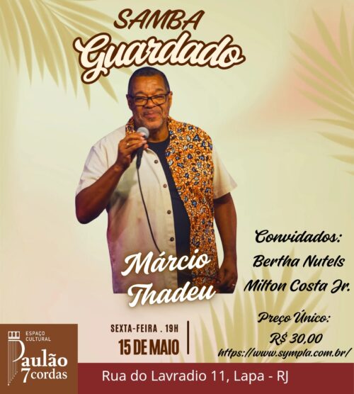 – DIA 15 DE MAIO, ÀS 19h, “SAMBA GUARDADO”, com MÁRCIO THADEU. Convidados: BERTHA NUTELS e MILTON COSTA JR. Local: Espaço Cultural Paulão 7 Cordas, Rua do Lavradio, 11, Lapa. R$ 30,00. IMPERDÍVEL!