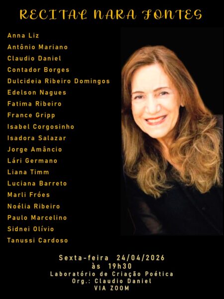 – HOJE, DIA 24 DE ABRIL, ÀS 19h30, “RECITAL NARA FONTES”, do Laboratório de Criação Poética, organização de CLAUDIO DANIEL. Entre outros: ANTÔNIO MARIANO, CONTADOR BORGES, EDELSON NAGUES, FATIMA RIBEIRO, FRANCE GRIPP, JORGE AMÂNCIO, NOÉLIA RIBEIRO e TANUSSI CARDOSO. Lista completa no card. Local: ZOOM.