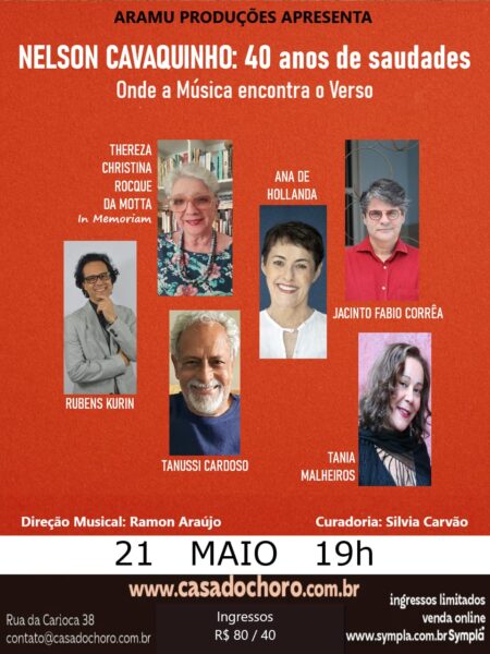 – DIA 21 DE MAIO, ÀS 19h, “NELSON CAVAQUINHO: 40 ANOS DE SAUDADES – Onde a música encontra o verso”, com TANIA MALHEIROS, ANA DE HOLLANDA, JACINTO FABIO CORRÊA, RUBENS KURIN e TANUSSI CARDOSO. Em memória de THEREZA CHRISTINA ROCQUE DA MOTTA. Direção musical: RAMON ARAÚJO. Curadoria: SILVIA CARVÃO. Local: Casa do Choro, Rua da Carioca, 38. Ingressos R$ 80 e 40.