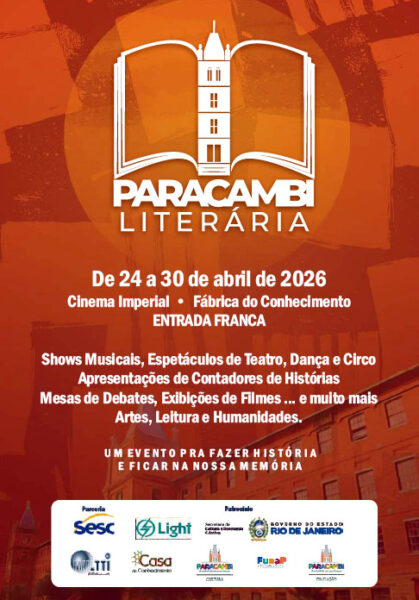 – DE HOJE, DIA 24, A 30 DE ABRIL, acontecerá o evento “PARACAMBI LITERÁRIA”, com shows musicais, teatro, dança, circo, contação de histórias, debates, filmes etc. NO DIA 28 DE ABRIL, ÀS 10h, “ENCONTRO COM A ARTE E O PENSAMENTO DE EUCLIDES AMARAL – A CONSTRUÇÃO HISTÓRICA DA MÚSICA POPULAR BRASILEIRA”. Local: Cinema Imperial. Entrada franca.