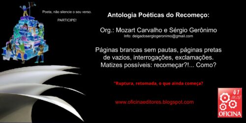 – A Oficina Editora está aguardando seu texto para a “ANTOLOGIA POÉTICAS DO RECOMEÇO”, organização de MOZART CARVALHO e SÉRGIO GERÔNIMO, com lançamento previsto para o 2º semestre. Informações: delgadosergiogeronimo@gmail.com