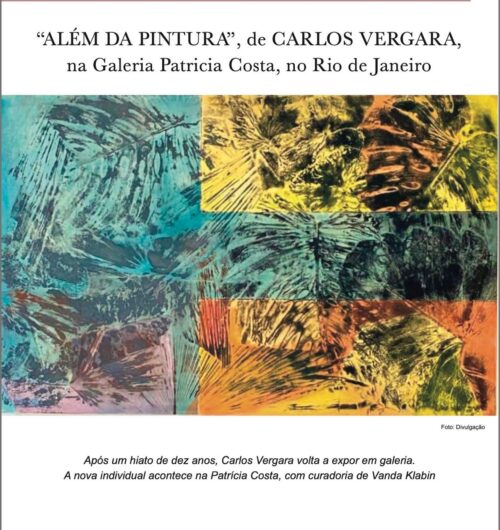 – ATÉ 27 DE SETEMBRO, “ALÉM DA PINTURA”, individual de CARLOS VERGARA com trabalhos inéditos. Local: Galeria Patrícia Costa, Shopping Cassino Atlântico, Av. Atlântica, 4240. Lojas 224 e 225, Copacabana. Segunda a sexta, das 11h às 19h. Sábado, até às 17h.