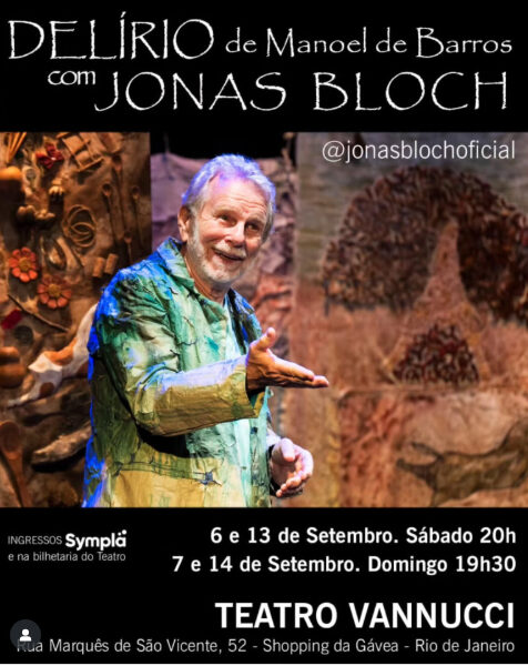 – ATÉ 14 DE SETEMBRO, “DELÍRIO”. Direção, autoria e interpretação: JONAS BLOCH. Inspirado na obra de MANOEL DE BARROS. Local: Teatro Vannucci, Shopping da Gávea. Sábado, às 20h; domingo: 19h30. R$ 100,00.