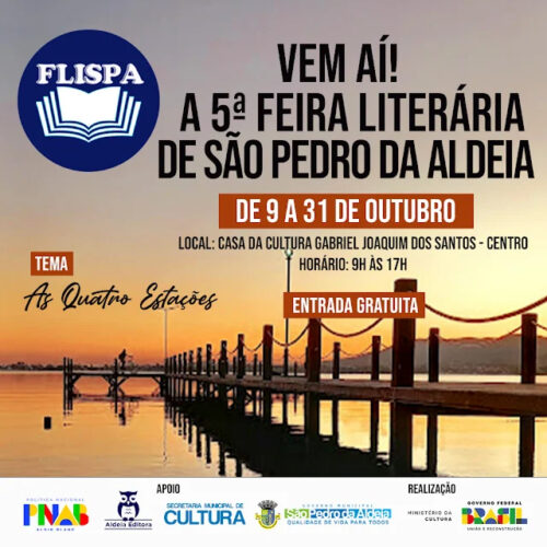 – DE 09 DE OUTUBRO ATÉ 31 DE OUTUBRO, DAS 9h às 17h, “5ª FEIRA LITERÁRIA DE SÃO PEDRO DA ALDEIA”, tendo à frente o escritor RENATO FULGONI, celebrando as Quatro Estações da Literatura. Local: Casa de Cultura Gabriel Joaquim dos Santos. Detalhes no link: