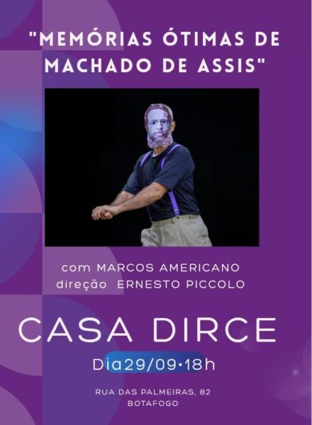 – DIA 29 DE SETEMBRO, ÀS 18h, “MEMÓRIAS ÓTIMAS DE MACHADO DE ASSIS”, com MARCOS AMERICANO. Direção: ERNESTO PICCOLO. Local: Casa Dirce, Rua das Palmeiras, 82.