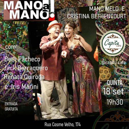 – DIA 18 DE SETEMRO, ÀS 19h30, “MANO A MANO”, com MANO MELO e CRISTINA BETHENCOURT. Convidados: BETH PACHECO, JACK BERRAQUERO, RENATA QUIROGA e IRIS MARINI. Local: Capitu Café, Rua Cosme Velho, 174. Gratuito.