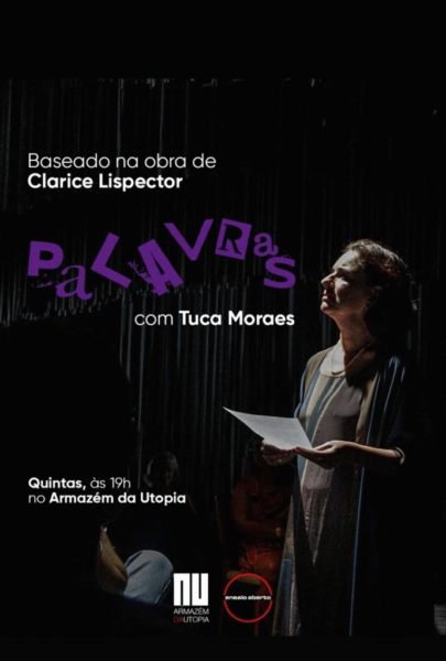 – ATÉ 25 DE SETEMBRO, “PALAVRAS”, com TUCA MORAES interpretando textos de CLARICE LISPECTOR, com a CIA. ENSAIO ABERTO. Direção: LUIZ FERNANDO LOBO. Local: Armazém da Utopia, Píer Mauá. Quinta, ÀS 19h. R$ 60,00.