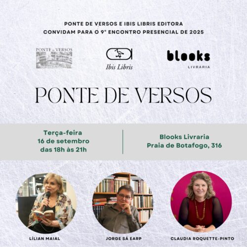 – DIA 16 DE SETEMBRO, DAS 18h às 21h, “PONTE DE VERSOS”, com LILIAN MAIAL, JORGE SÁ EARP e CLAUDIA ROQUETTE- PINTO. Local: Blooks Livraria, Praia de Botafogo, 316.