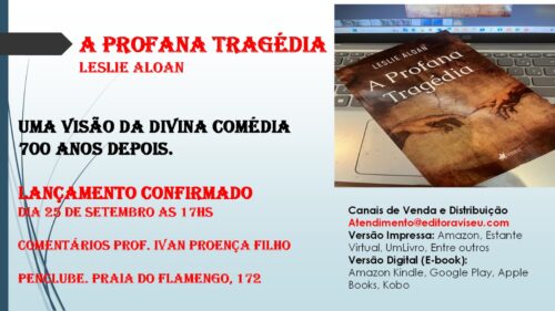 – DIA 25 DE SETEMBRO, ÀS 17h, “A PROFANA TRAGÉDIA”, de LESLIE ALOAN, uma visão da Divina Comédia 700 anos depois. Comentários: Prof. IVAN PROENÇA FILHO. Local: PEN Clube, Praia do Flamengo, 172.