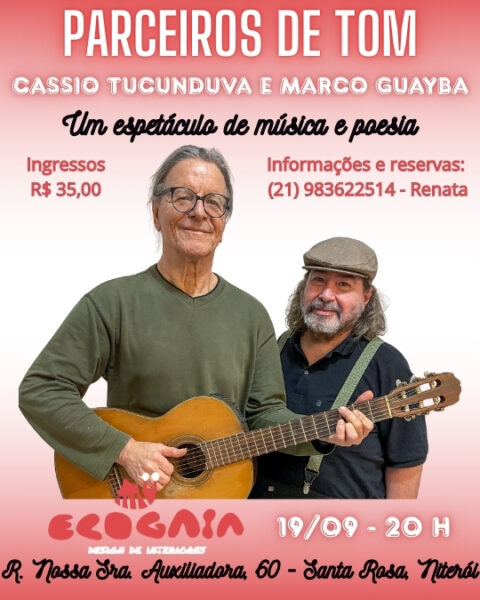 – DIA 19 DE SETEMBRO, ÀS 20h, “PARCEIROS DE TOM”, com CASSIO TUCUNDUVA e MARCO GUAYBA. Local: Ecogaia, Rua Nossa Sra. Auxiliadora, 60.