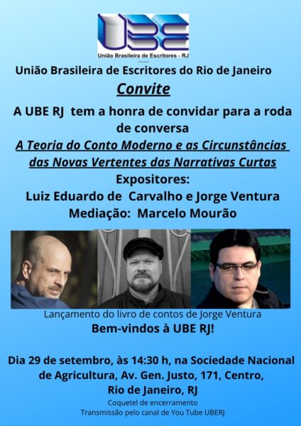 – DIA 29 DE SETEMBRO, ÀS 14h30, “A TEORIA DO CONTO MOODERNO E AS CIRCUNSTÂNCIAS DAS NOVAS VERTENTES DAS NARRATIVAS CURTAS”. Expositores: LUIZ EDUARDO DE CARVALHO e JORGE VENTURA. Mediação: MARCELO MOURÃO. Local: UBE RJ, Sociedade Nacional de Agricultura, Av. Gen. Justo, 171, Centro. MAIORES DETALHES NO POSTER.