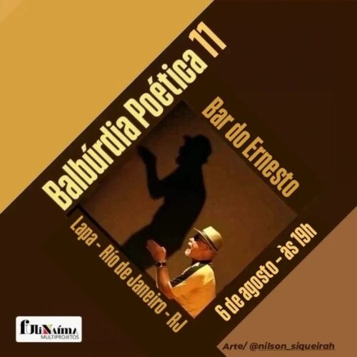Cazuza Exagerado– DIA 06 DE AGOSTO, ÀS 19h30, “BALBÚRDIA POÉTICA 11 – Poesia ali na mesa”. Curadoria: ARTUR GOMES, JORGE VENTURA e TANUSSI CARDOSO. Homenagens a AFFONSO ROMANO DE SANT’ANNA, ANTÔNIO CÍCERO, ARMANDO FREITAS FILHO e TAVINHO PAES. Local: Bar do Ernesto, Lapa.