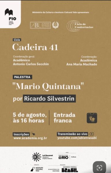 – DIA 05 DE AGOSTO, ÀS 16h, a ABL convida para o seu “Ciclo de Conferências” – “CICLO CADEIRA 41”. Coordenação geral: ANTONIO CARLOS SECCHIN. Coordenação: ANA MARIA MACHADO. Palestra: “MARIO QUINTANA”, por RICARDO SILVESTRIN. Local: ABL. Entrada franca. Detalhes no poster.