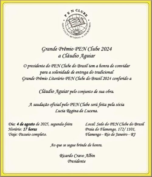 – DIA 04 DE AGOSTO, ÀS 17h, o PEN CLUBE DO BRASIL convida para a solenidade de entrega do “GRANDE PRÊMIO LITERÁRIO PEN CLUBE DO BRASIL 2024”, cujo vencedor foi o escritor CLÁUDIO AGUIAR, pelo conjunto da obra. A saudação será feita por LUCIA REGINA DE LUCENA. Local: PEN Clube do Brasil, Praia do Flamengo 172 / 1101, Flamengo. Traje passeio completo. Detalhes no poster.