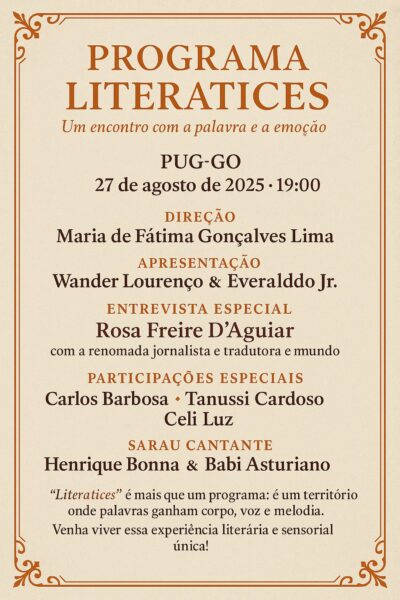 – DIA 27 DE AGOSTO, ÀS 19h, “PROGRAMA LITERATICES – Um encontro com a palavra e a emoção”. Direção: MARIA DE FÁTIMA GONÇALVES LIMA. Apresentação: WANDER LOURENÇO & EVERALDO Jr. Entre as atrações, as participações especiais de CARLOS BARBOSA, TANUSSI CARDOSO e CELI LUZ. Organização: PUC-GO. MAIORES DE TALHES NO POSTER.