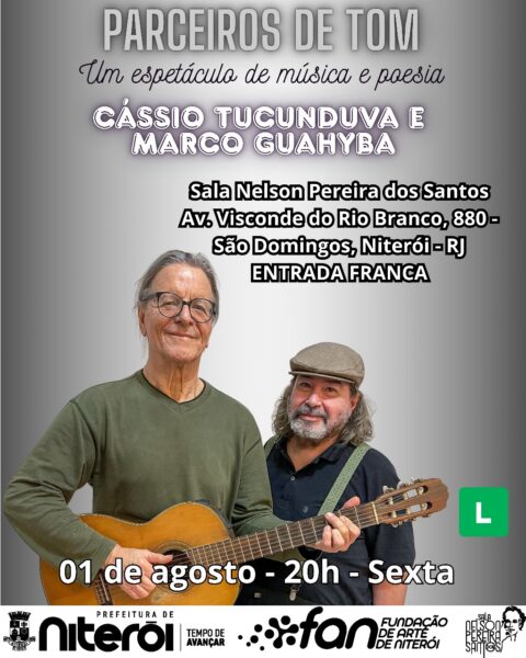 – HOJE, DIA 01 DE AGOSTO, ÀS 20h, CÁSSIO TUCUNDUVA e MARCO GUAHYBA em “PARCEIROS DE TOM – um espetáculo de música e poesia”. Local: Sala Nelson Pereira dos Santos, Av. Visconde do Rio Branco, 880, São Domingos, Niterói. Entrada franca.