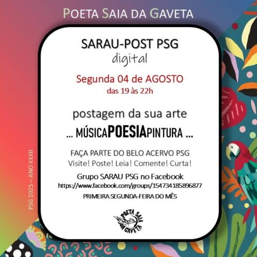 – DIA 04 DE AGOSTO, DAS 19h ÀS 22h, “POETA SAIA DA GAVETA – SARAU-POST PSG – digital”. Poste sua arte: música, poesia, pintura… Local: Facebook: Grupo Sarau PSG.