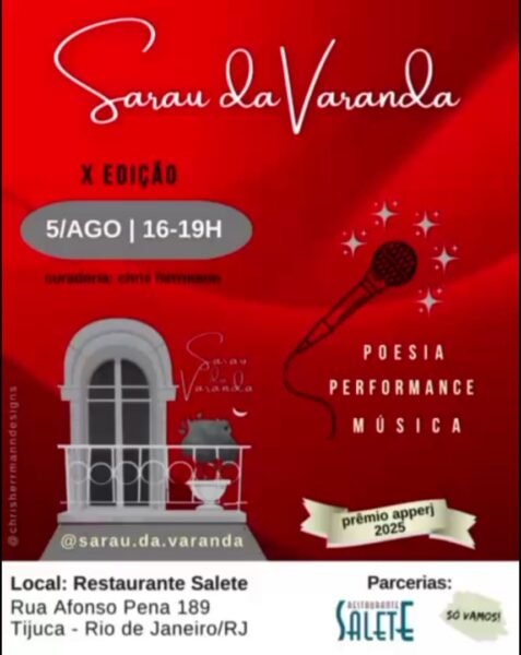 – DIA 05 DE AGOSTO, DAS 16h ÀS 19H, “SARAU DA VARANDA” (Prêmio APPERJ 2025), organização de CHRIS HERRMANN. Poesia, performance, música. Local: Restaurante Salete, Rua Afonso Pena, 189, Tijuca.