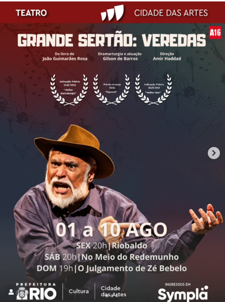 – ATÉ 10 DE AGOSTO, “TRILOGIA GRANDE SERTÃO: VEREDAS”. Direção: AMIR HADDAD. Com GILSON DE BARROS que encena peças inspiradas na obra de GUIMARÃES ROSA: SEXTA: “RIOBALDO”; SÁBADO: “NO MEIO DO REDEMUNHO”; DOMINGO: “JULGAMENTO DE ZÉ BEBELO”. SEXTA e SÁBADO, ÀS 20h; DOMINGO, ÀS 20h. R$ 80,00. Local: Cidade das Artes, Sala Eletroacústica), Barra.