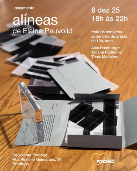 – AMANHÃ, DIA 06 DE DEZEMBRO, DAS 18h ÀS 22h, “ALÍNEAS”, de ELAINE PAUVOLID, que comemora seu aniversário, além de uma roda de conversa com ALEX HAMBURGER, TATIANA PODIUBNY e THAIS MEDEIROS. Local: Recipiente Porongo, Rua Pinheiro Guimarães, 34, Botafogo. TODOS LÁ!