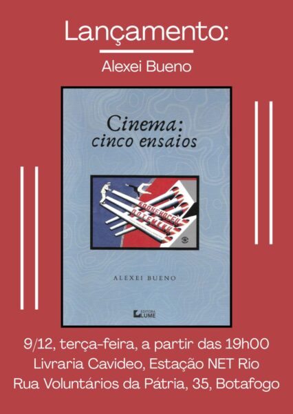 – DIA 09 DE DEZEMBRO, A PARTIR DAS 19h, “CINEMA: CINCO ENSAIOS”, de ALEXEI BUENO. Local: Livraria Cavideo, Estação NET Rio, Rua Voluntários da Pátria, 35, Botafogo.