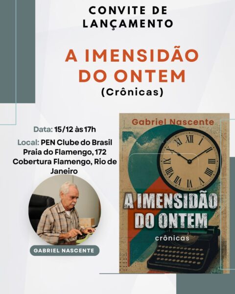 – DIA 15 DE DEZEMBRO, ÀS 17h, “A IMENSIDÃO DO ONTEM”, Crônicas, de GABRIEL NASCENTE. Local: PEN Clube do Brasil, Praia do Flamengo, 172, cobertura, Flamengo.